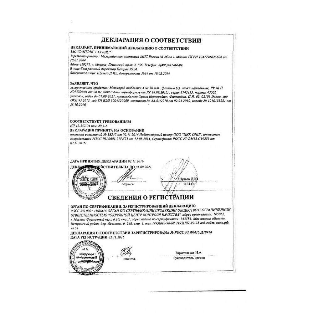 1 таблетка содержит: метилпреднизолона – 16 мг.