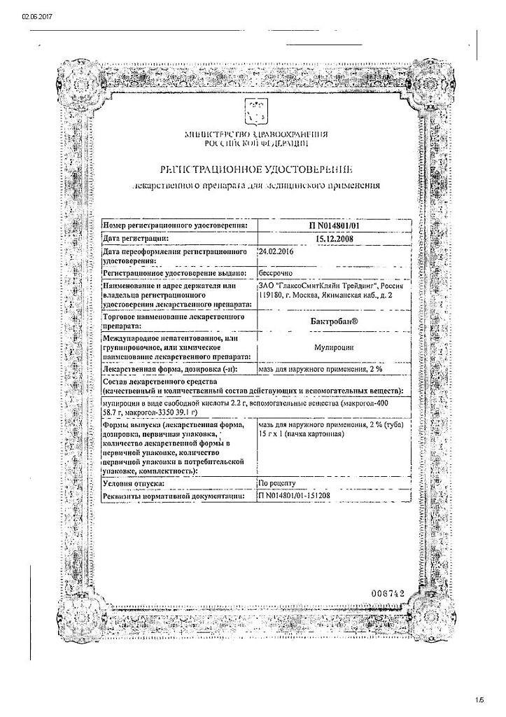 Применение. Мазь для наружного применения Бактробан, наносят на пораженный участок кожи 3 раза в сутки, при необходимости накладывают асептическую повязку. Курс лечения - до 10 дней.