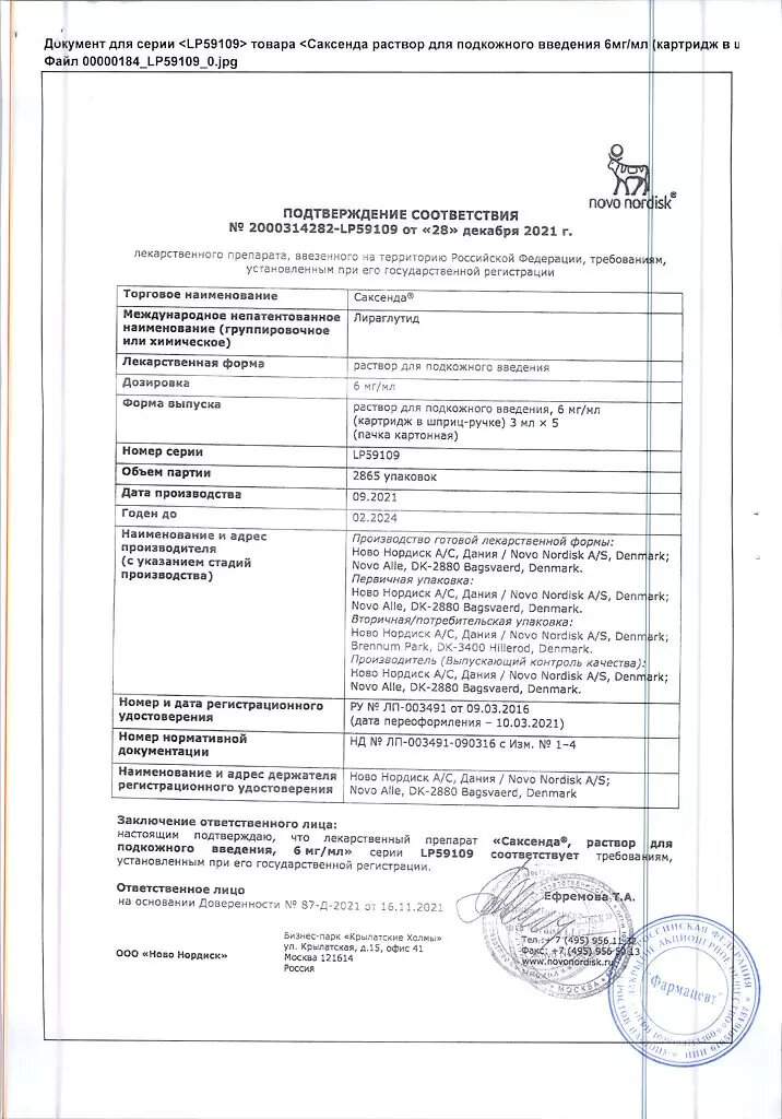 Активное вещество лираглутид 6 мл/1 мл.