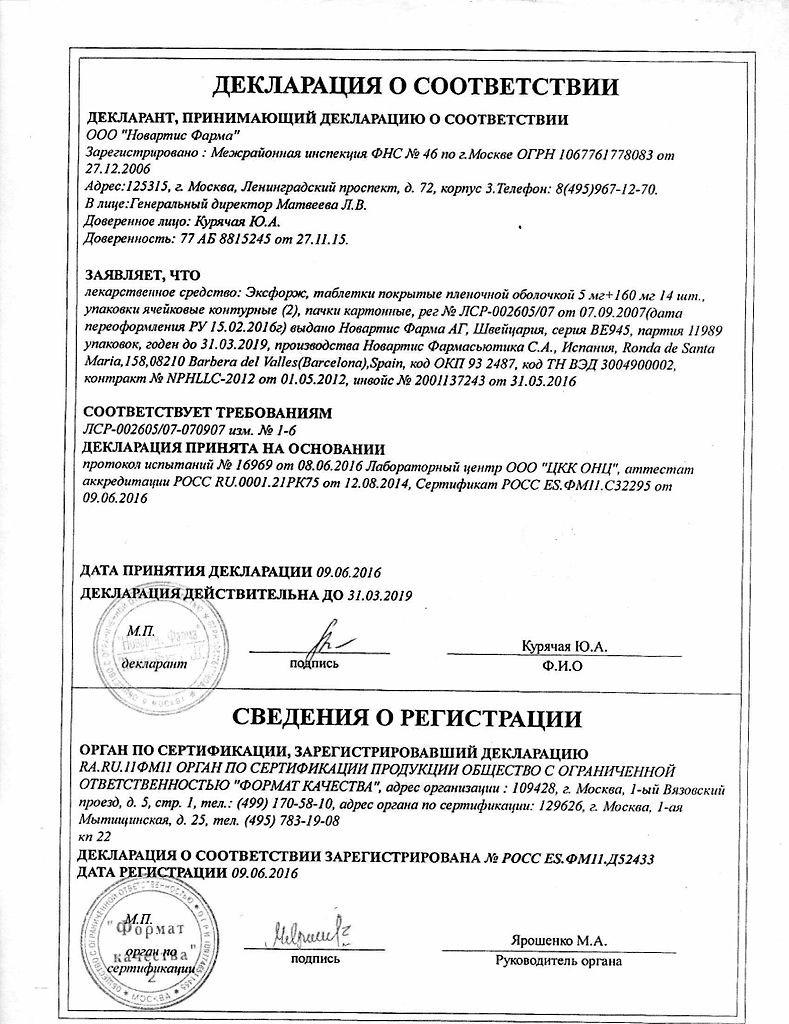 Эксфорж - антигипертензивный медикамент. Содержит комбинацию из двух действенных компонентов. Амлодипин принадлежит к группе антагонистов кальция. Его относят к производным дигидропиридина. Механизм воздействия на организм аплодипина полностью не установлен, но доказано, что некоторые эффекты играют важную роль в регуляции артериального давления. Рассматриваемый активный компонент связывается со специальными рецепторами на миокарде и в стенках сосудов, блокирует ионные каналы, избирательно проницаемые для ионов кальция. Поступление Ca в клетку снижается. Реализуется биохимический механизм расслабления гладких миоцитов, в основном за счет снижения актин-миозин-АТФазной активности. Сосуды расширяются, в том числе коронарные, снижается общее сопротивление всей сосудистой системы организма, которое непосредственно влияет на величину артериального давления. Кроме того, снижает потребность сердечных мышц в кислороде. Вещество медленно действует, поэтому нет опасности развития острой артериальной гипотензии. Не оказывает негативного влияния на пациентов с астмой или сахарным диабетом. Препарат можно применять лицам, страдающим поражениями суставов, вызванными нарушением обмена веществ. Лекарственное средство усиливает кровоток в сосудах почек. Кардинально не влияет на частоту сокращений сердца, а также на показатель уровня катехоламинов в кровотоке. Второе вещество – валсартан - блокатор рецепторов ангиотензина 2. Действует на почечном уровне. Ангиотензин 2 обладает сосудосуживающей активностью, реализующейся после взаимодействия со специальными рецепторами в миокарде, стенках сосудов, головном мозге и в других органах. Чтобы снизить давление, сосуд, наоборот, необходимо расширить, что и обеспечивает валсартан, конкурентно связываясь с этими специфическими рецепторами. Главные составляющие препарата в необходимых комбинациях и дозах взаимно дополняют друг друга. Лечение двухкомпонентным лекарством намного эффективней, чем употребление амлодипина и валсартана в виде монотерапевтических средств. Артериальное давление постепенно снижается после трех недель лечения и сохраняется при длительной терапии. После прекращения приема препарата нет риска развития синдрома отмены.